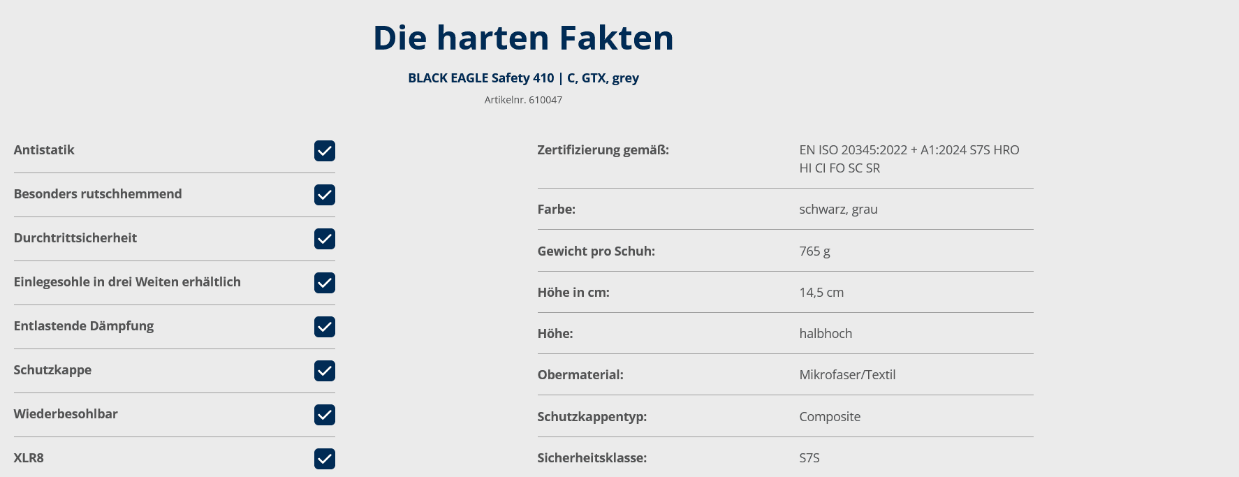 BeschreibungMerkmaleHerstellerProduktverantwortlicherBewertungen Beschreibung Merkmale GORE-TEX® Ja DGUV 121-191 (BGR 191) orthopädische Einlagen ESD Ja Zwischensohle "No-Metall" Zehenschutzkappe Kunststoff Hersteller HAIX Schuhe Produktions und Vertriebs GmbH Auhofstr. 10 84048 Mainburg Produktverantwortlicher info@haix.de Bewertungen Geben Sie die erste Bewertung ab Es liegen keine Bewertungen vor Tags Black Eagle 51 Regen 85 S3 59 Sicherheitsschuh 78 sportlich 133