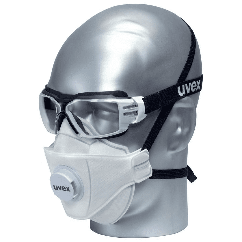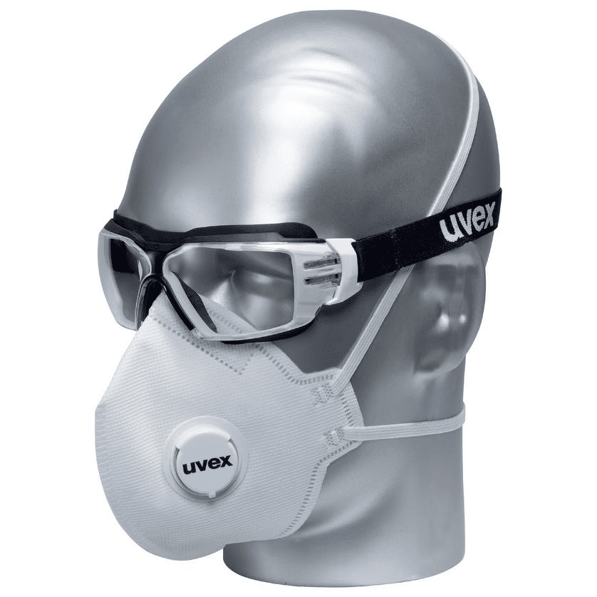 Ein weiches, längenverstellbares Textilkopfband gewährleistet einen sicheren, angenehmen Sitz und ermöglicht eine sehr gute Kombinierbarkeit mit weiterer persönlicher Schutzausrüstung. Zusätzlich erhöhen die direkt angespritzte, weiche Stirn- und Nasenauflage den Tragekomfort und schützen zuverlässig vor dem Eindringen von Flüssigkeiten und Grobstaub.